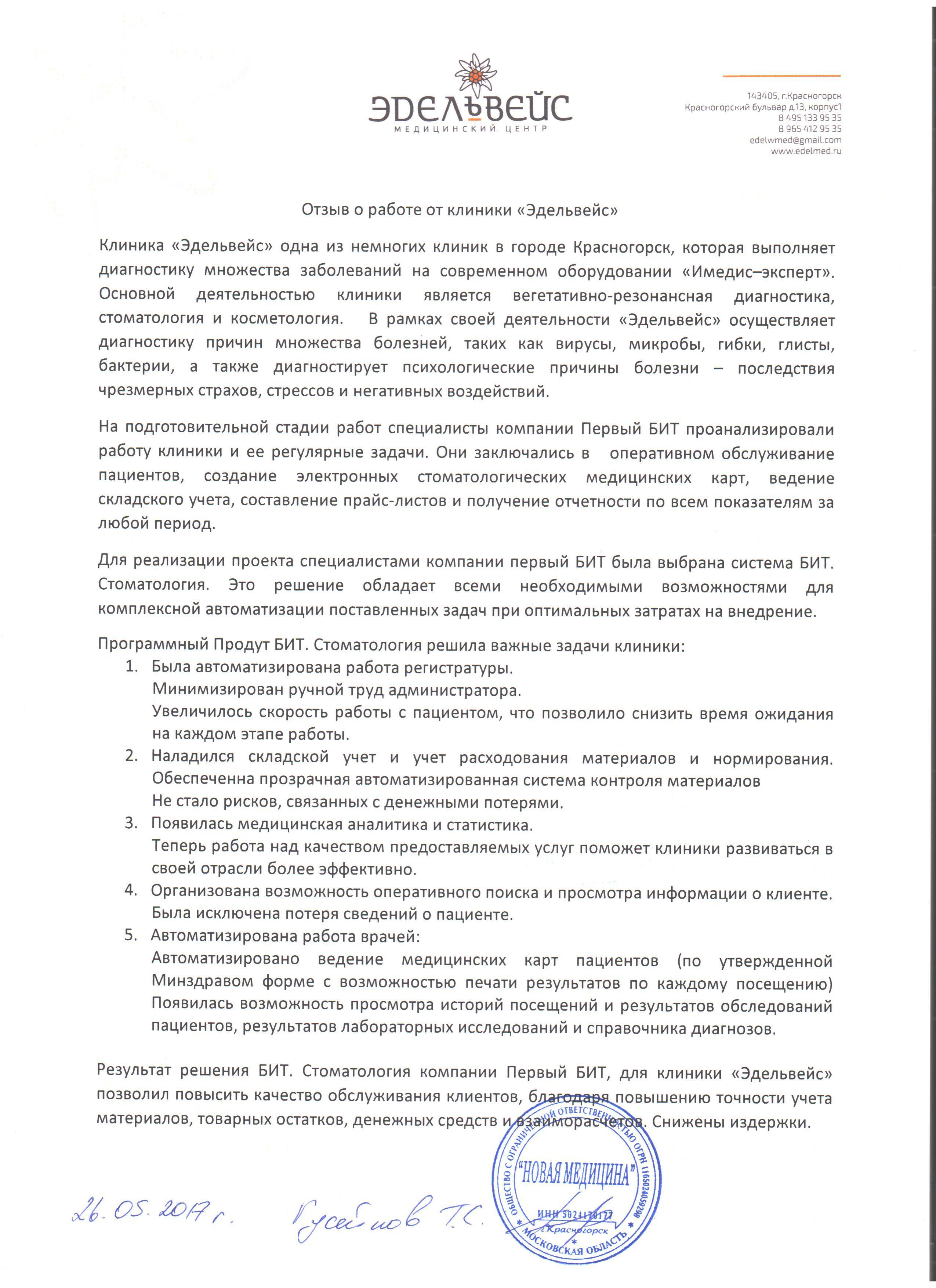 Клиника "Эдельвейс" одна из немногих клиник в городе Красногорске, которая выполняет диагностику множества заболеваний на современном оборудовании "Имедиус-эксперт". Основной деятельностью клиники является вегетативно-резонансная диагностика, стоматология и косметология.